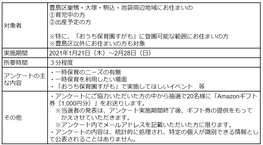 一時保育サービス検討にあたり、豊島区巣鴨・大塚・駒込・池袋周辺における一時保育のニーズを確認し、より使いやすいサービス設計ができるように、周辺地域にお住まいの①育児中の方、②出産予定の方を対象に、アンケートを行いますので、ご協力お願いいたします!
