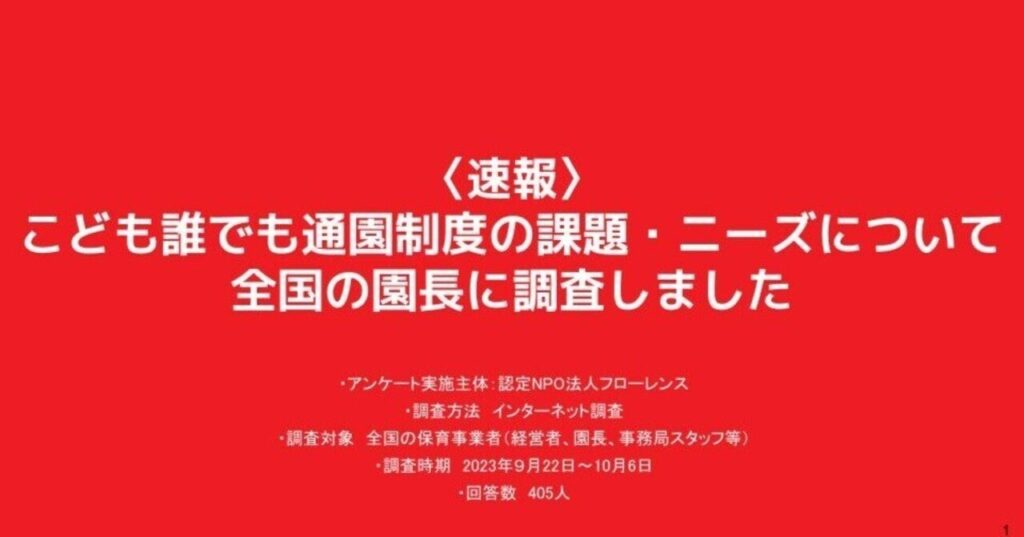 僕たちフローレンスは、制度の担い手となる保育現場の声を集めるべく、保育事業者を対象とした「制度の課題とニーズ」に関する全国アンケート調査を実施!(調査期間:2023年9月22日~10月6日、回答数:405人)