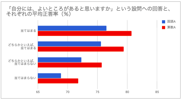 自己肯定感の低さは、学力格差とも関連します。文部科学省の調査によれば、「自分にはよいところがあると思う」と考えている子どものほうが全国学力テストの正答率が高かったという結果が出ました。