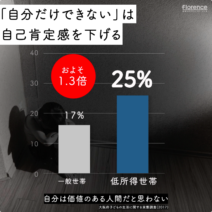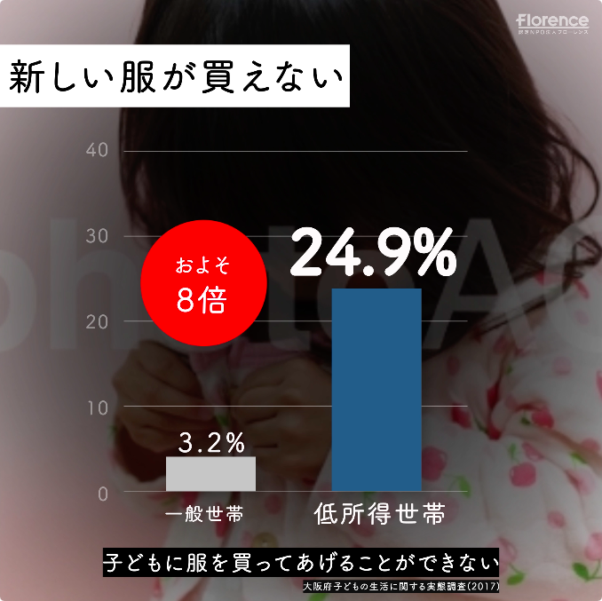 大阪府の調査によれば、子どもに新しい服を買えない、家族旅行に行けない、大学に進学させてあげられないなど、貧困家庭では経済的な理由によって子どものためにしてあげられることが大きく制限される傾向がありました。