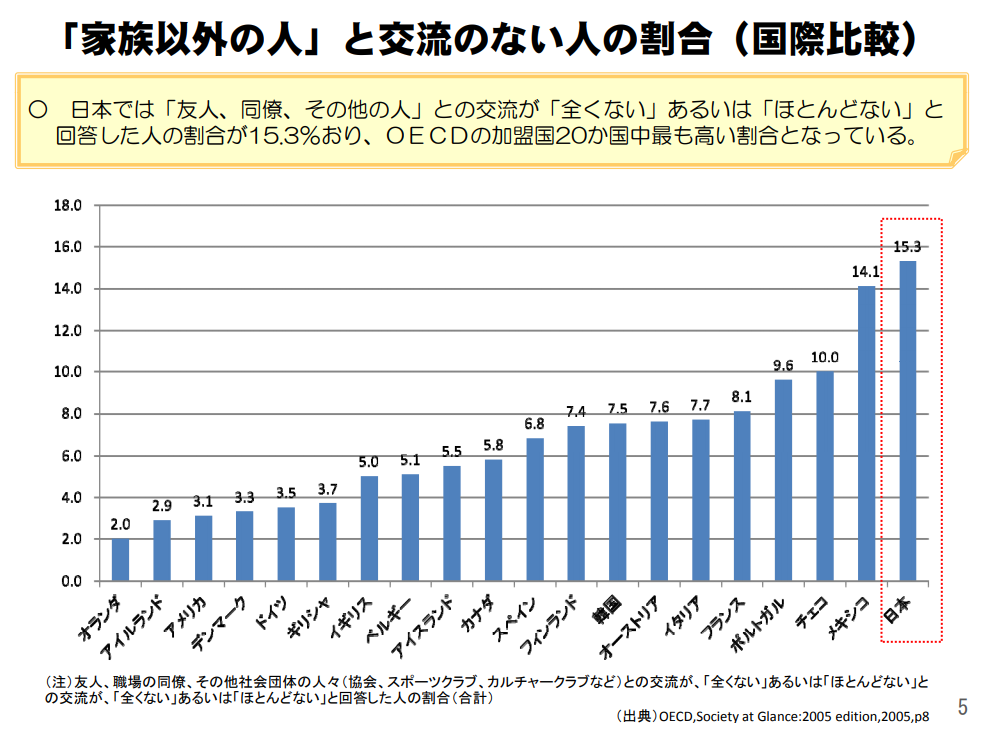 友人や同僚、地域のコミュニティなどとの交流が「ほとんど無い・無い」と答えた人の割合が、日本は20ヶ国中トップでした。