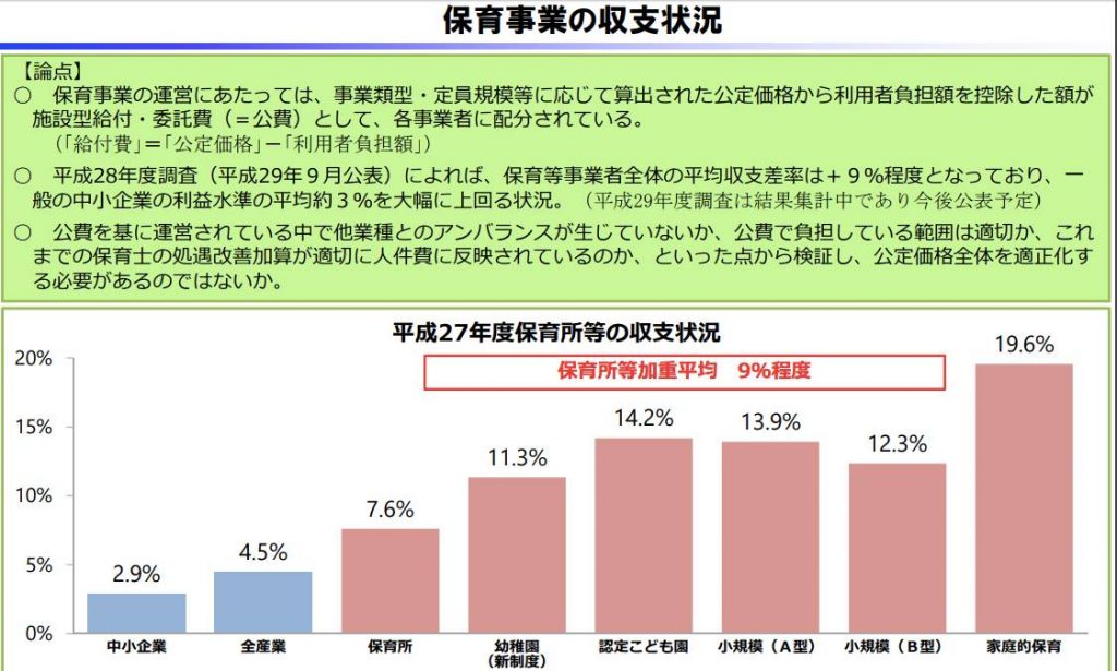 保育事業者の利益率は全産業平均より高めのため、財務省は一部補助をやめても事業者の経営に大きな支障は出ないと判断した。人件費補助はこれまで通り続け、施設運営費の補助を削減する。