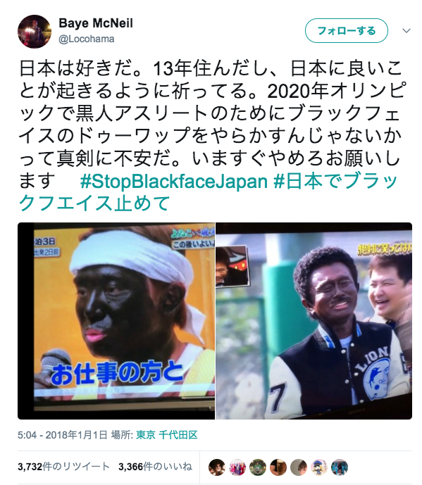 『私の気持ちは半々です。半分の私は、日本のテレビコメディーや音楽でブラックフェイスを見るたび、見下されたような、馬鹿にされたような、そして表面だけを見られて、人間性を否定されているような気分になります。私の肌の色が、私自身の人間性が、芝居の小道具、あるいは脚本にされたかのように感じるのです。しかし、もう半分の私は、『彼らは子供で、わかっていないだけ。だから我慢しなきゃ』とも思うのです』『敬意を持って、一緒に生きていこうと決めた日本の人たちに対して、このような感情を抱いてしまうのは、つらいことです。』