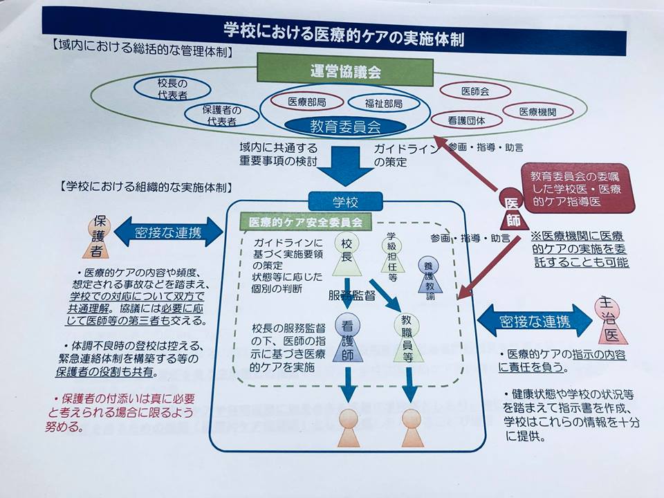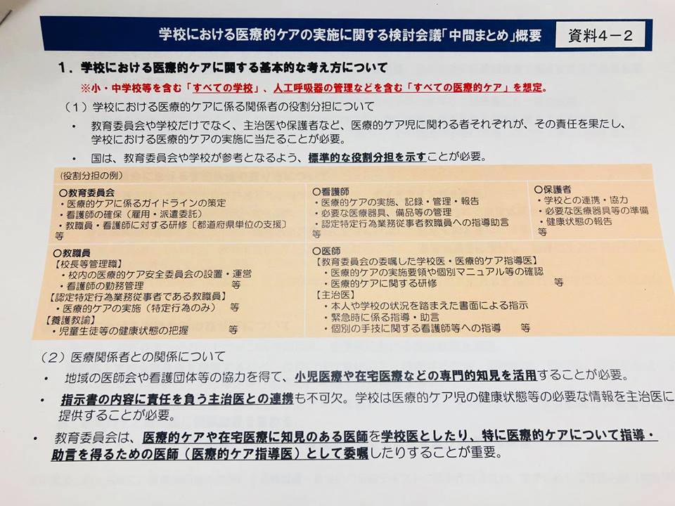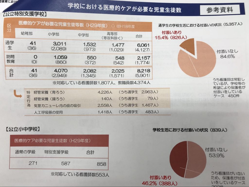 医療的ケア児は特別支援学校だけでなく、通常の学校に行く場合もあり、そういう時でも対応できるようにするんだぞ、と。特別支援学校じゃないからできません、じゃなくて。