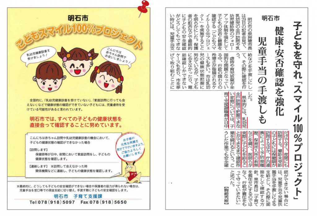 泉市長のこの施策は、「こどもスマイル100%プロジェクト」( https://city-akashi-kosodate.jp/kosodateshienka/1401.html )と名付けられ、実際に100%会うことに成功しているそうです。