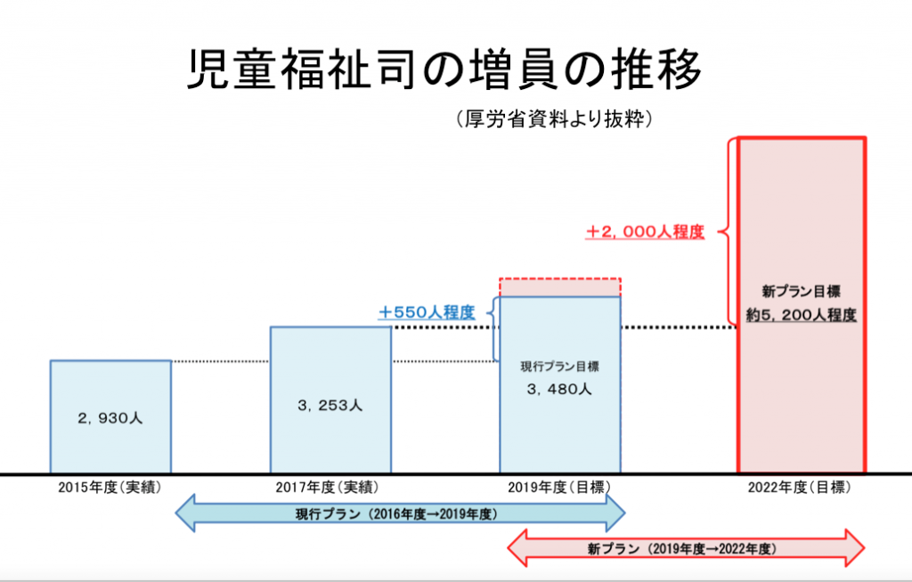 これまでの児童福祉司の推移は、年間約100人ずつ程度(3%)の増員なので、単純計算で5倍の増員規模となります。