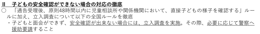 これまでも「通告受理後、原則48時間以内に子どもの様子を確認する」ルールは存在していましたが、今回の対策で「全国一律で」ということと「確認できない場合は立ち入りましょう」というルールが追加されました。