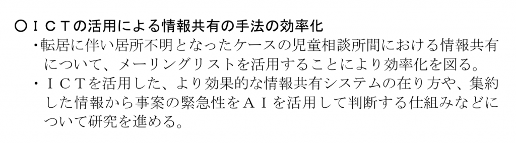 なお、今回、「より効果的な情報共有システム」や「事案の緊急性をAIを活用して判断する仕組み」について初めて言及してくださったので、児童虐待八策で提起したかいがあったと思いました。