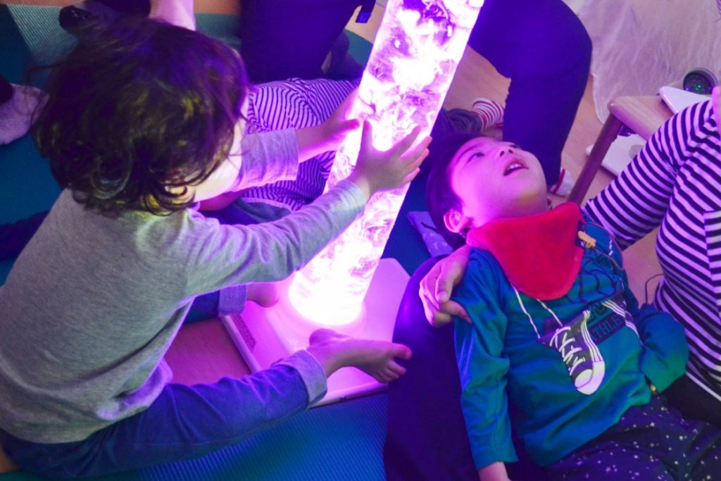 ヘレン経堂にあるスヌーズレンは、ドーム状の光源装置と、バブルタワー(水の入った筒の機械)。スイッチを押すと光が回転しながら空間を照らします。