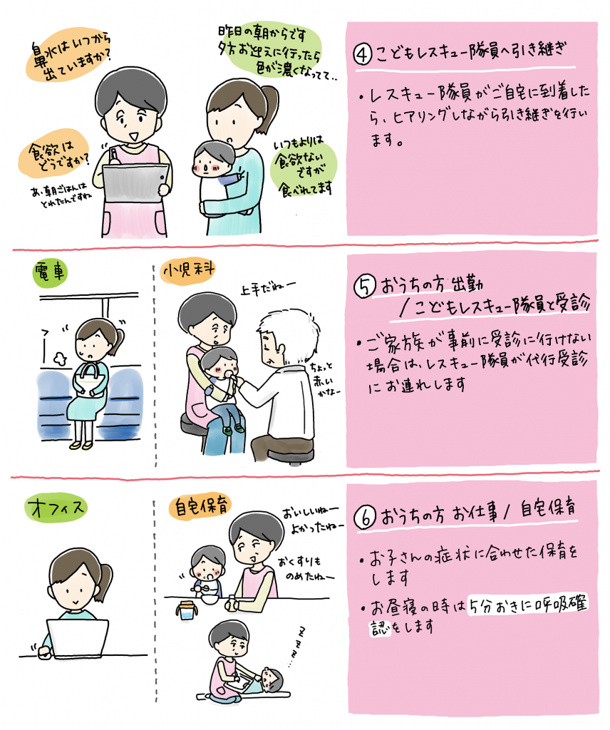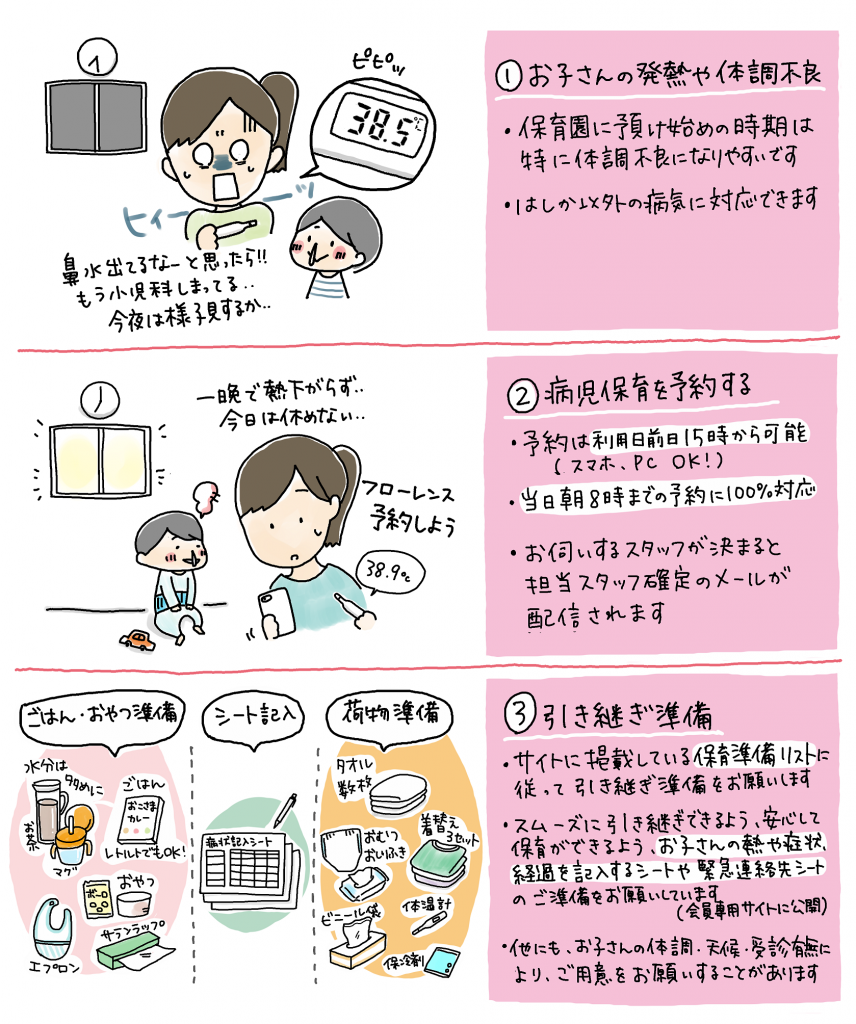 そんな親御さんの「困った!」という日を想定して、なんと『フローレンスの病児保育がある1日』をマンガにしてもらいました。