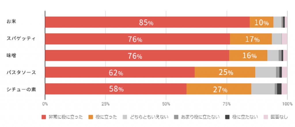 では、具体的にどういった食品が役立ったのでしょうか?アンケートでは、お米やスパゲッティなどの主食が人気でした。ご利用家庭からは、「何よりお米が一番うれしいです。子どもたちが食べ盛りなこともあり、日持ちのするスパゲッティやレトルトソースは本当に役に立ちます 」との声もありあした。