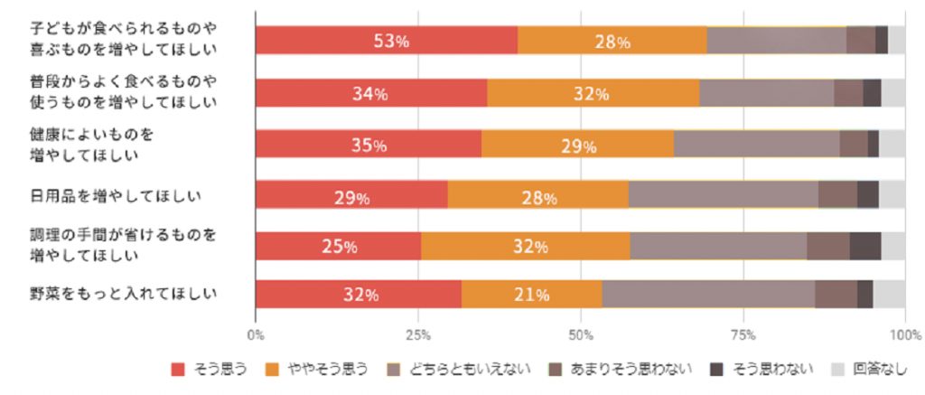 特に多かったのは「子どもが食べられるものや、喜ぶものを増やしてほしい」「普段からよく食べるものや使うものを増やしてほしい」という要望です。