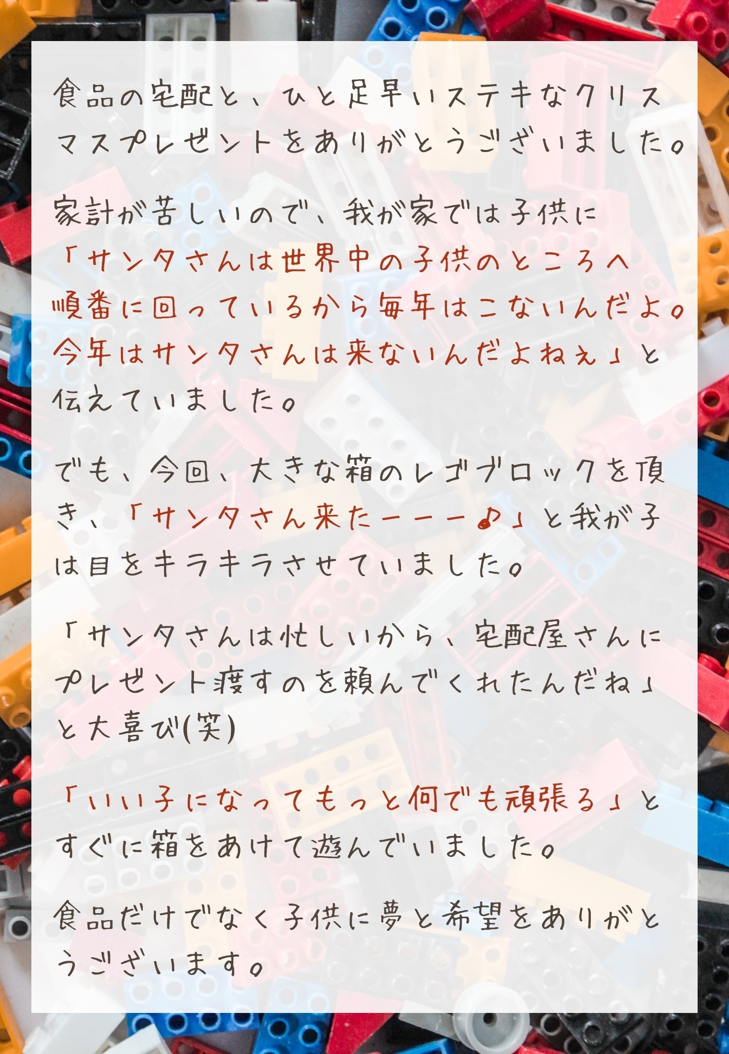 そして、この916セットを、文京区・佐賀・宮崎・長崎・新潟のこども宅食を通じて、クリスマスプレゼントとして配ったわけです。