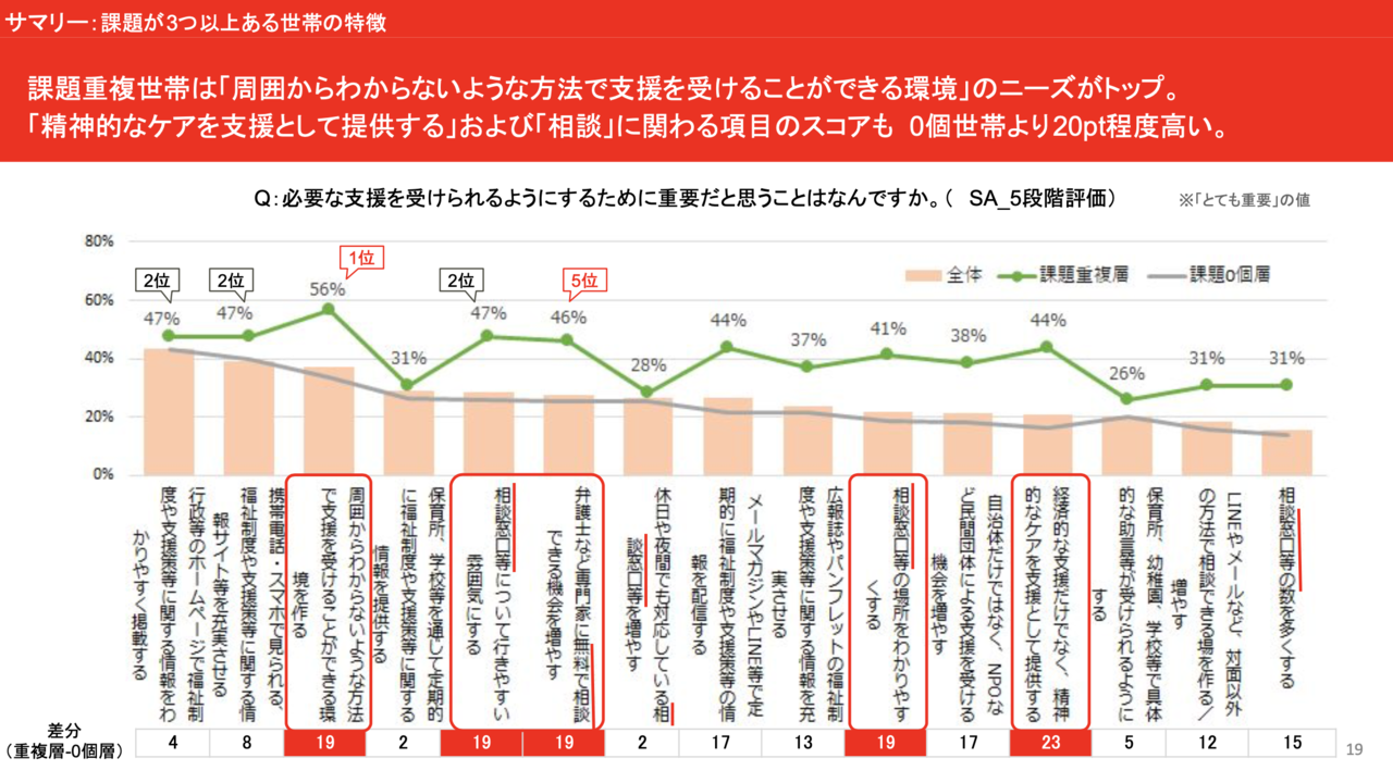 また、課題が重複している、つまり、より困っている度合いが高い家庭ほど、「周囲から知られたくない」というニーズが高いことも分かりました。