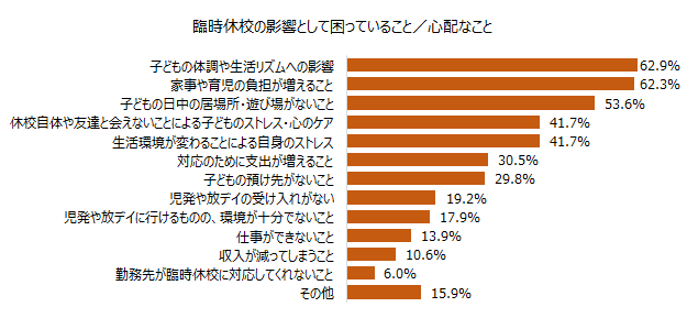 「臨時休校の影響として困っていること、心配なこと」という質問に対して、お子さんの通う学校が休校になった当事者151名のうち62.3%にあたる94人が、「家事や育児の負担が増えること」と回答しています。