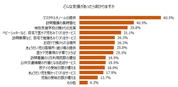 「どんな支援があったら助かりますか」という質問に対して、回答者190名のうち60.5%にあたる115人が、「マスクやエタノールの提供」と回答しています。