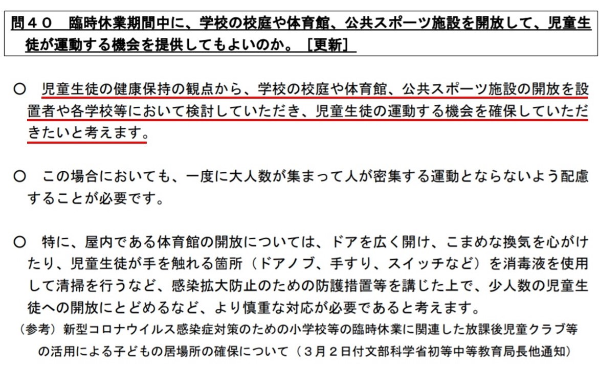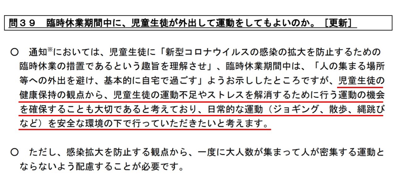 なんと面会後、その日のうちに全国の各自治体・各学校施設に通達されるQ&Aが更新されました。子どもの外出、校庭開放についても明記されています。