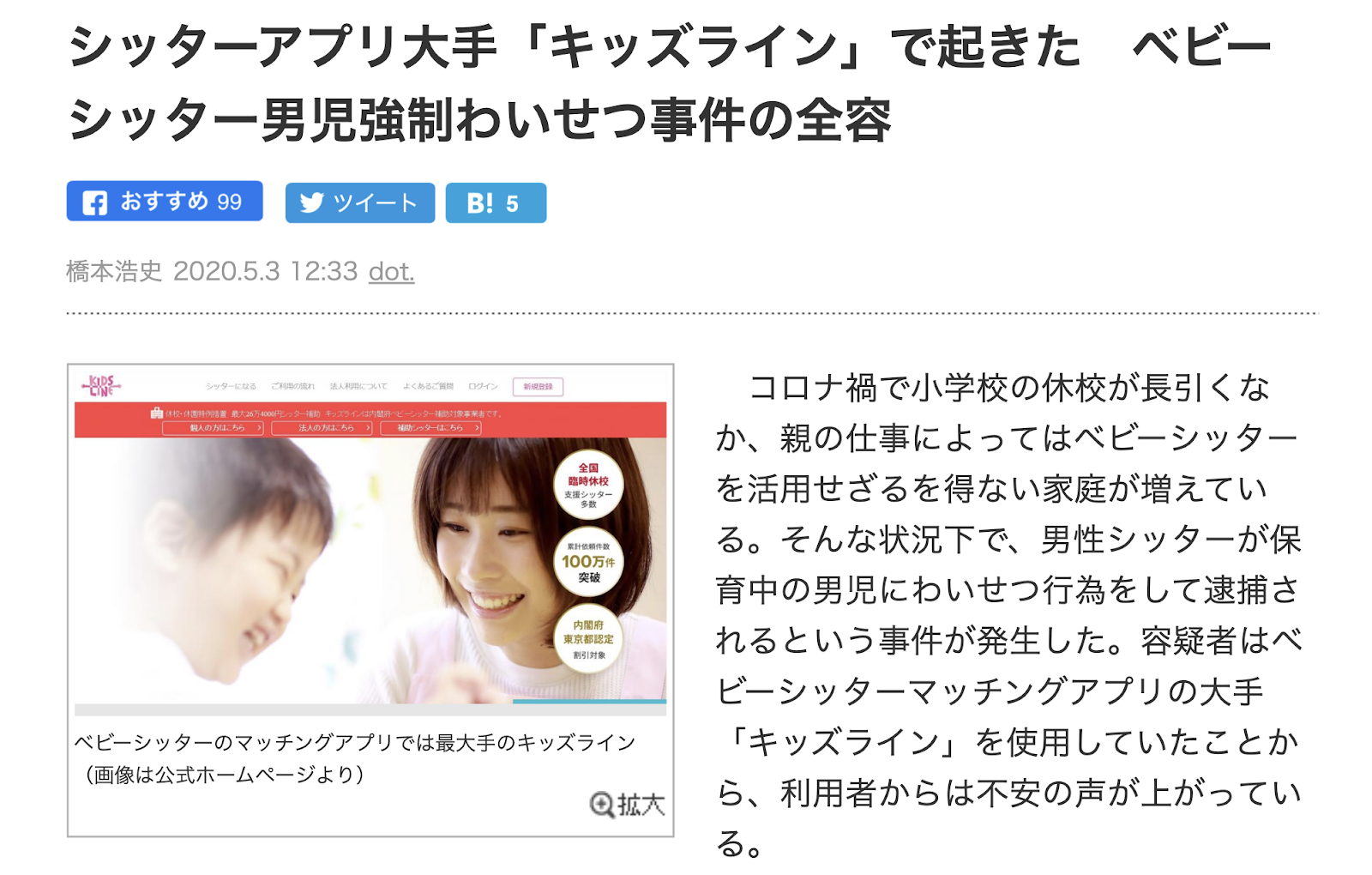 4月24日、ベビーシッターマッチングアプリの大手「キッズライン」に登録していた元ベビーシッターの男性が、保育していた5歳の男児のズボンを脱がせて下半身を触ったとして、強制わいせつ容疑で逮捕されたとの報道がAERAでありました。