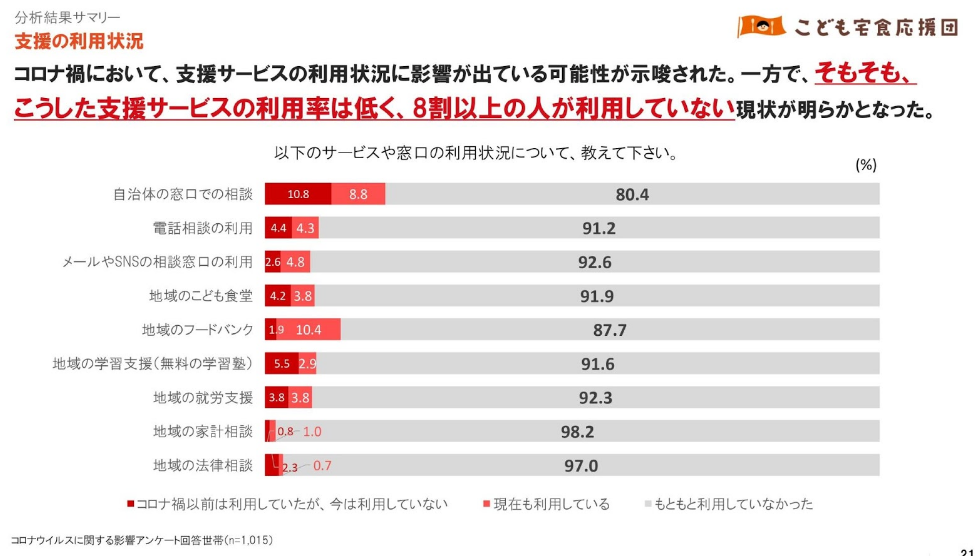生活困窮家庭等への定期的な食品配送と見守りを実施する「こども宅食」の全国普及活動を行っている「一般社団法人こども宅食応援団」が今年5月にこども宅食利用者にアンケートを行ったのですが、生活に困っているにも関わらず、殆どの人が行政などの各種支援サービスを利用していないという結果が出ました。例えば、自治体の窓口で相談したことがない人が80.4%、地域の就労支援を利用したことがない人が92.3%に登りました。