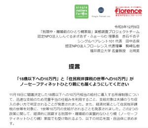 フローレンスは、11月19日に閣議決定した18歳以下への10万円相当の給付に対して、認定NPO法人しんぐるまざあず・ふぉーらむ、シングルペアレント101、北明美福井県立大学名誉教授とともに緊急提言をしました!