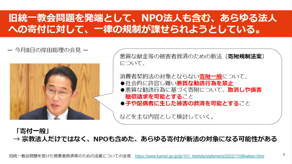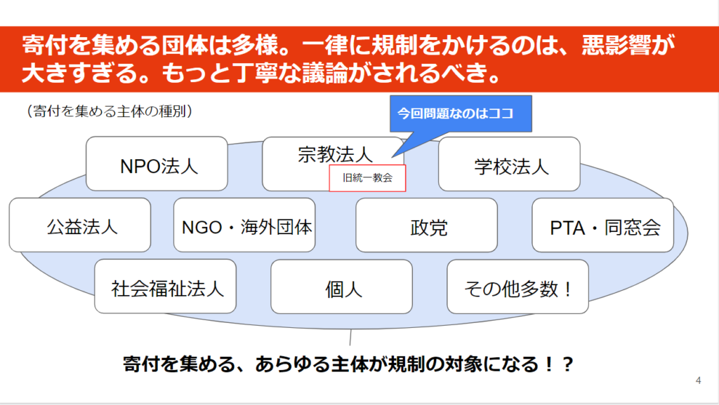 霊感商法や高額献金に苦しむ被害者の方々への救済は、早期に行われるべきだと僕も思いますし、むしろNPOは被害者の方々を支える役割を担っていけると考えます。しかし、今回問題を起こしたのは旧統一教会なのに、良いことをしている他の法人にまで規制をかけるのはおかしいです。