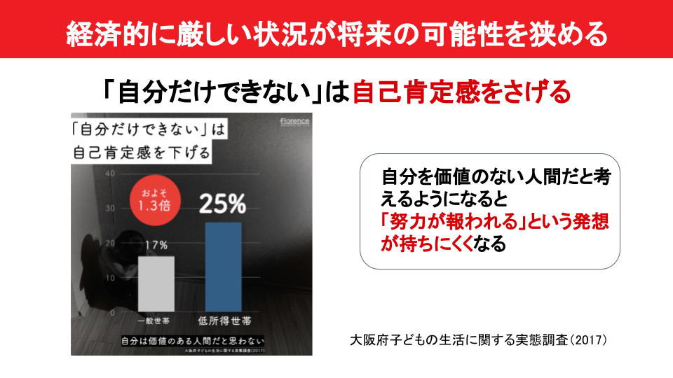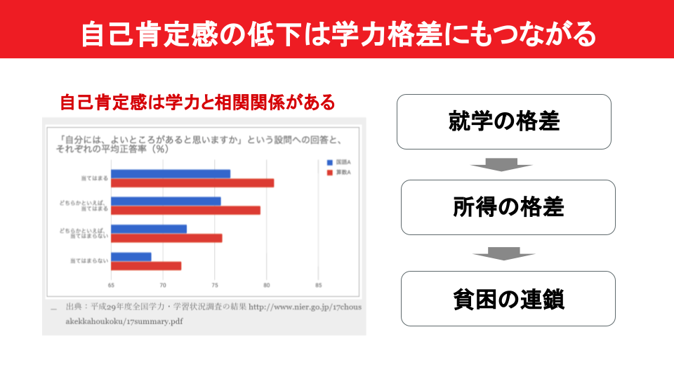 逆に、自己肯定感が低いと、「どうせ自分なんて」という気持ちになって、学力も下がってしまうという統計がでています。学力の差は、就学の差、所得の差を生み出し、そして、貧困の連鎖に繋がります。