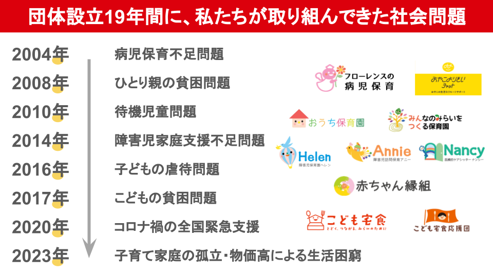 それから19年間、日本の子ども・子育て領域の課題に一つひとつ向き合い、待機児童問題、医療的ケア児や重症心身障害児を抱える障害児家庭への支援不足問題、子どもの虐待、子どもの貧困、子育て家庭の孤独孤立の問題、ひとり親や多胎児家庭の支援不足問題の解決を目指してきました。