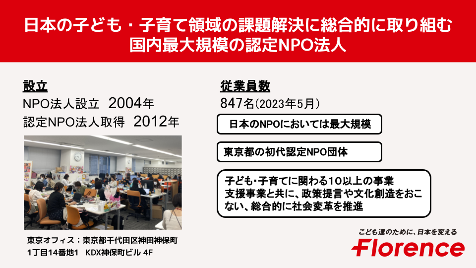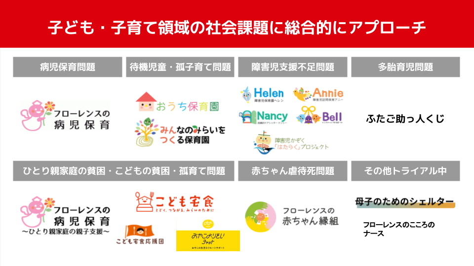 こども達のために、日本を変える。日本の子ども・子育て領域に関わる課題解決と価値創造に取り組む、国内最大規模の認定NPO法人です。日本初の訪問型・共済型病児保育事業で2004年に設立し、子どもの虐待、子どもの貧困、障害児家庭の支援不足、親子の孤立の課題を解決するため、多様な保育事業を運営するほか、全国で「こども宅食」「おやこよりそいチャット」「にんしん相談」「赤ちゃん縁組」などの福祉事業と支援活動、政策提言をおこなっています。