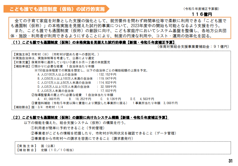 制度開始に向けて、2023年度中から自治体が試行的事業を開始できるように、こども家庭庁は令和5年度補正予算をとっています。
