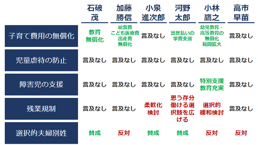 今回の総裁選でも、「幼児教育・高等教育の無償化範囲の拡大」「特別支援教育や障害児支援の充実、教育と福祉の連携促進」「いじめや不登校に対する支援」などの子育て関連政策を打ち出しています。