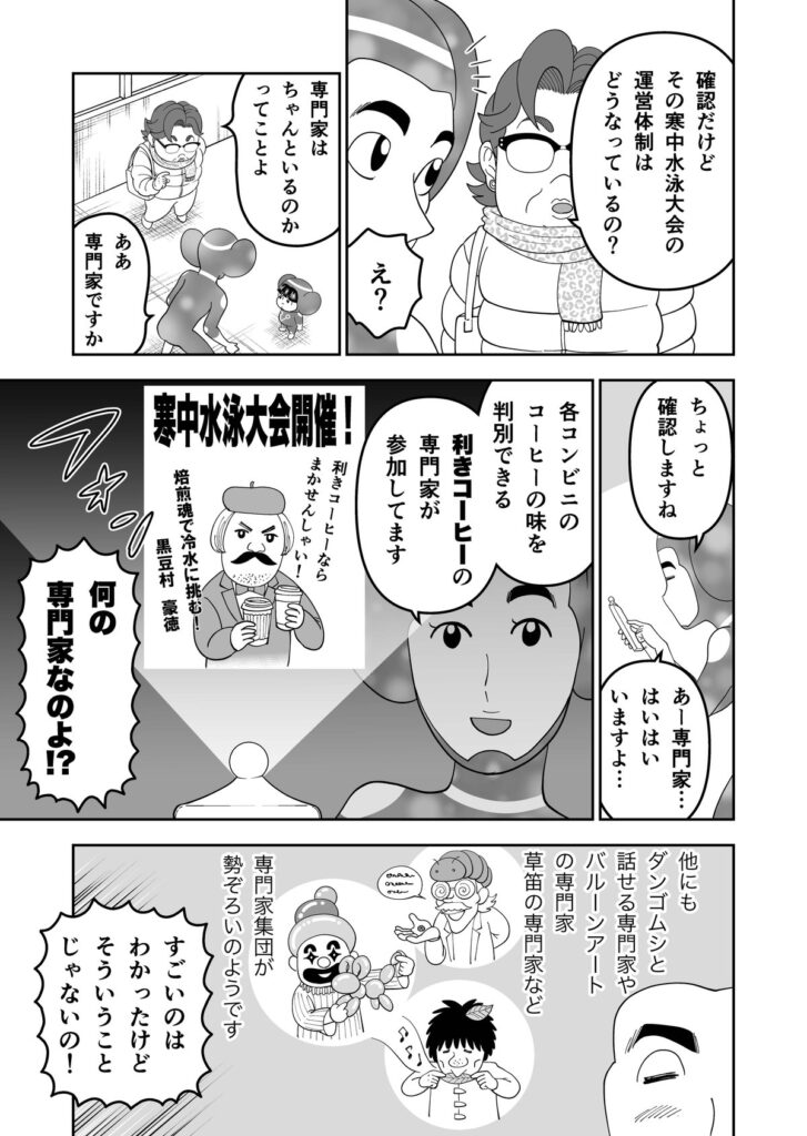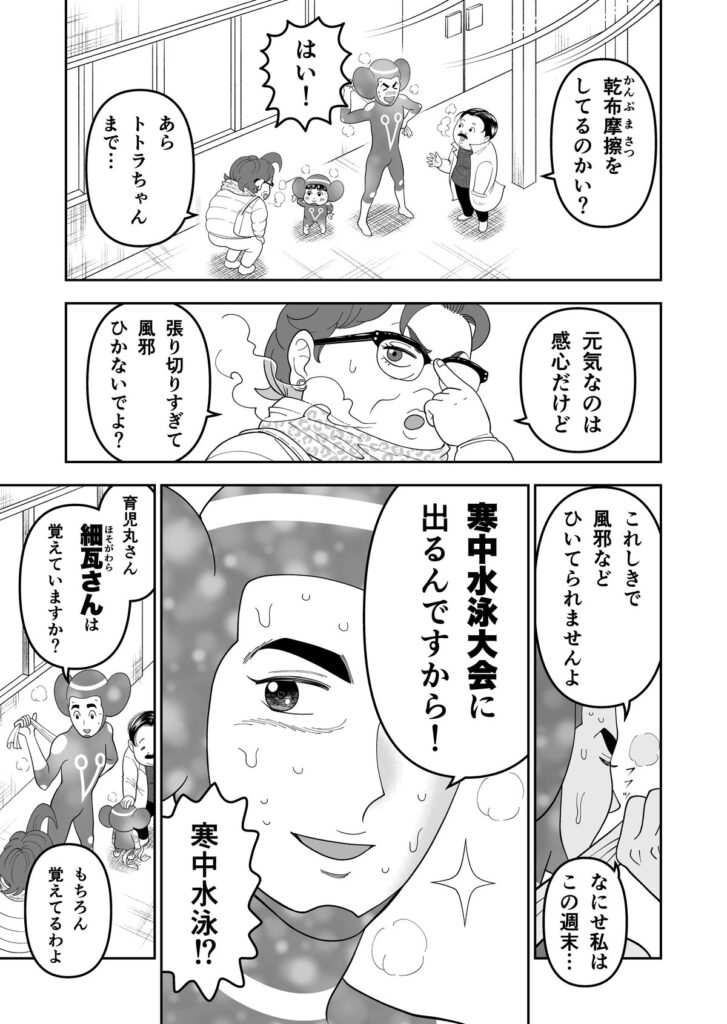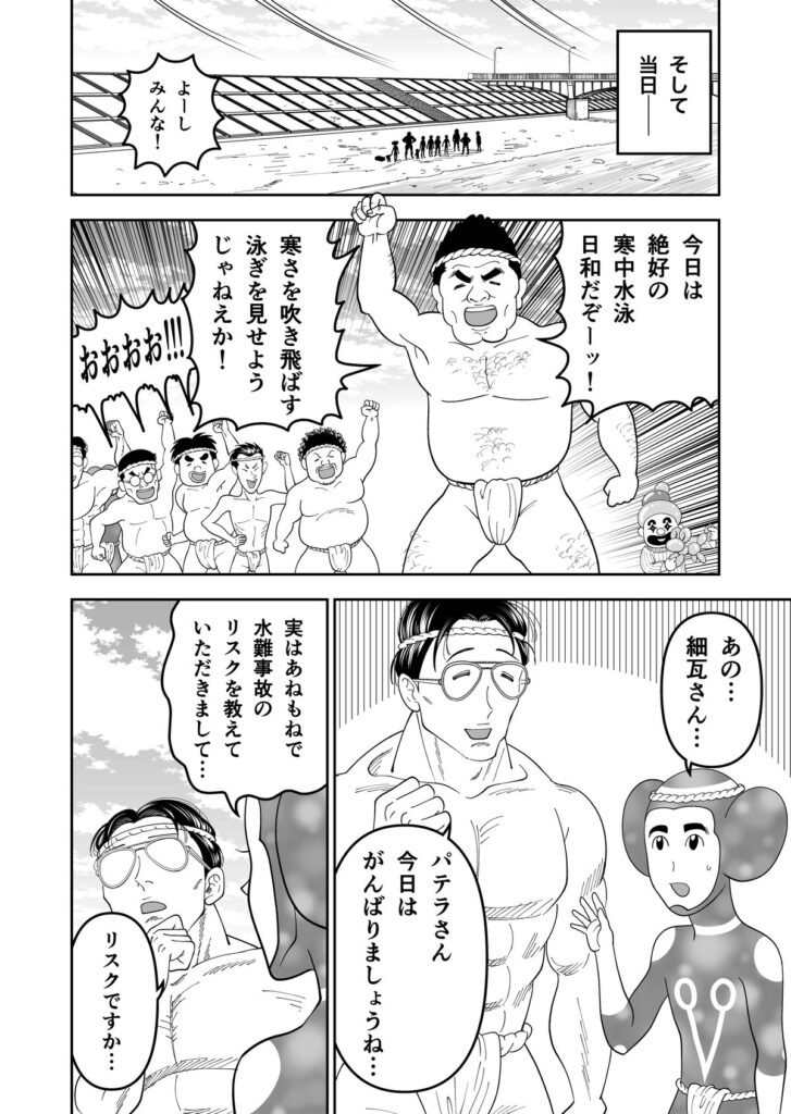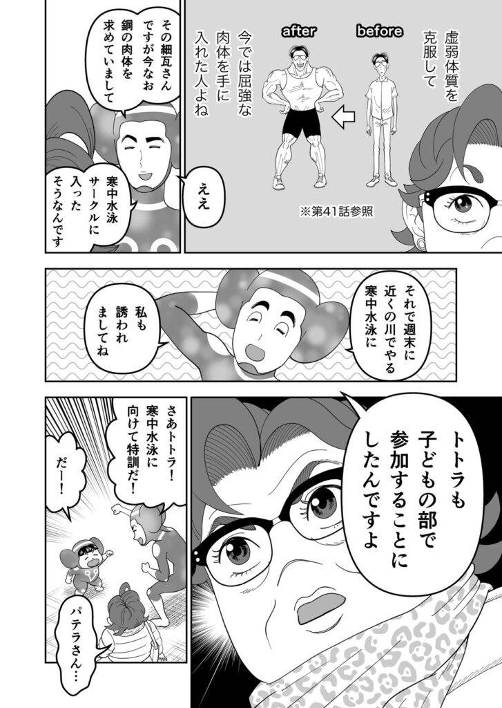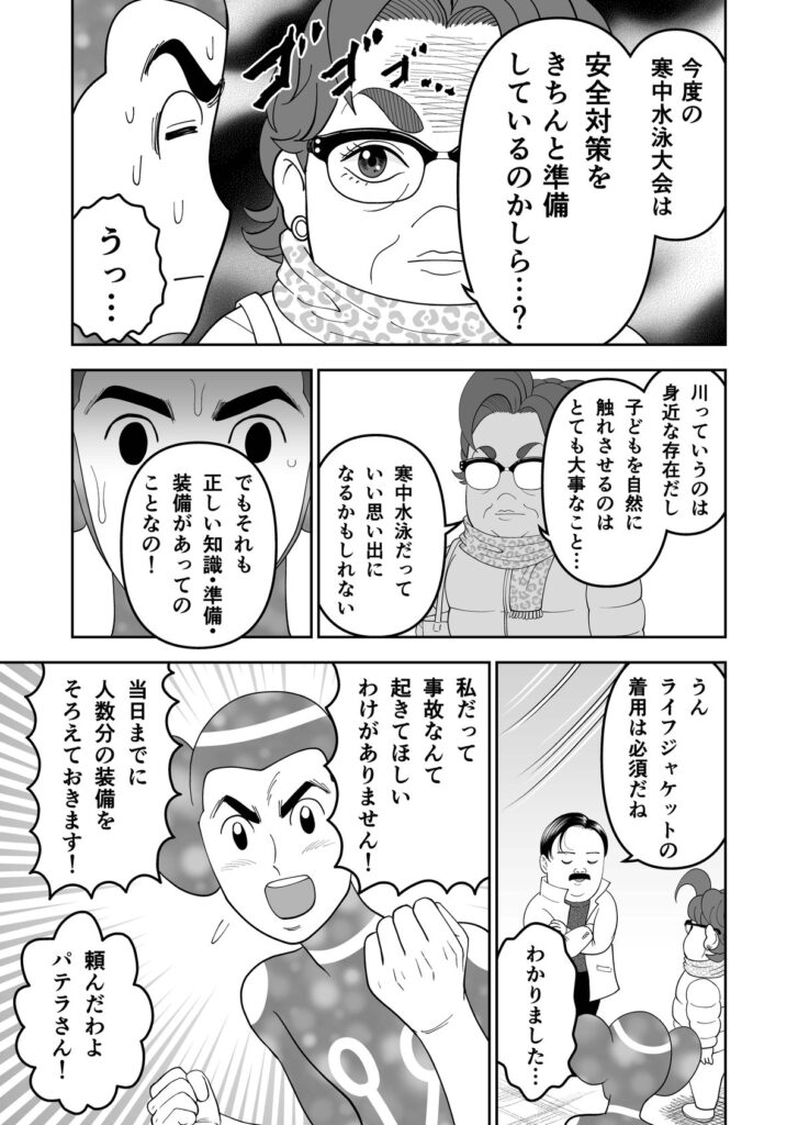 親子で寒中水泳大会に出ることになり、張り切るパテラさん。