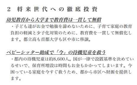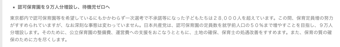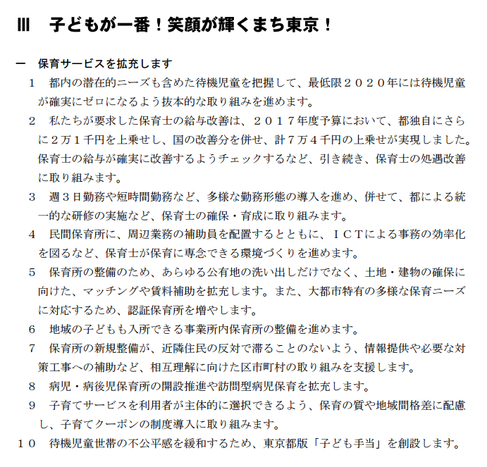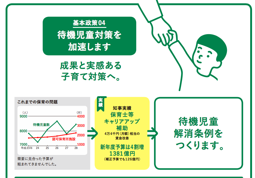 ・公約の方は「待機児童解消条例」という曖昧なものですが、政策集では政策の詳細に踏み込んでいます