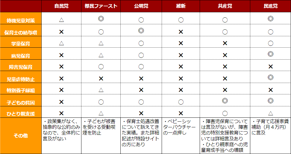 ・全体的には、公明党・都民ファースト・民進党の公約が、子育て支援における各領域をカバーしていると言って良いでしょう