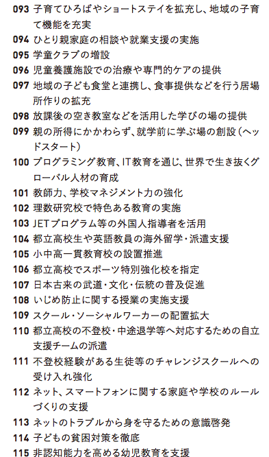 ・保育士処遇改善、病児保育、障害児保育、子どもの貧困等、言葉すら出てこず、あまりにカバーしていないテーマが多すぎます