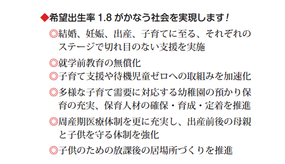 ・特に医療的ケア児やダウン症等、障害児に対する記述は他党より多く、マイノリティへの配慮が伺えます