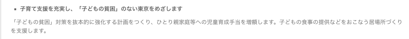 ・また子どもの貧困対策は、小中学校での給食無償化、都独自の給付型奨学金拡充、学習塾の受講料支援、居場所作り等、各党と比較しても最も充実しています