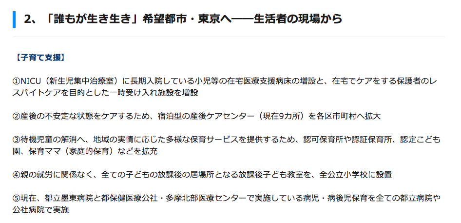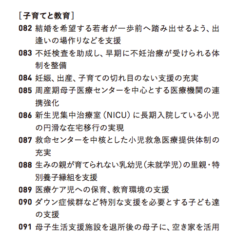 ・「在宅で(障害児を)ケアをする保護者のレスパイトケアを目的とした一時受け入れ施設を増設」「産後の不安定な状態をケアするため、宿泊型の産後ケアセンターを拡大」等、インフラが行き渡っていない領域への言及を行なっています