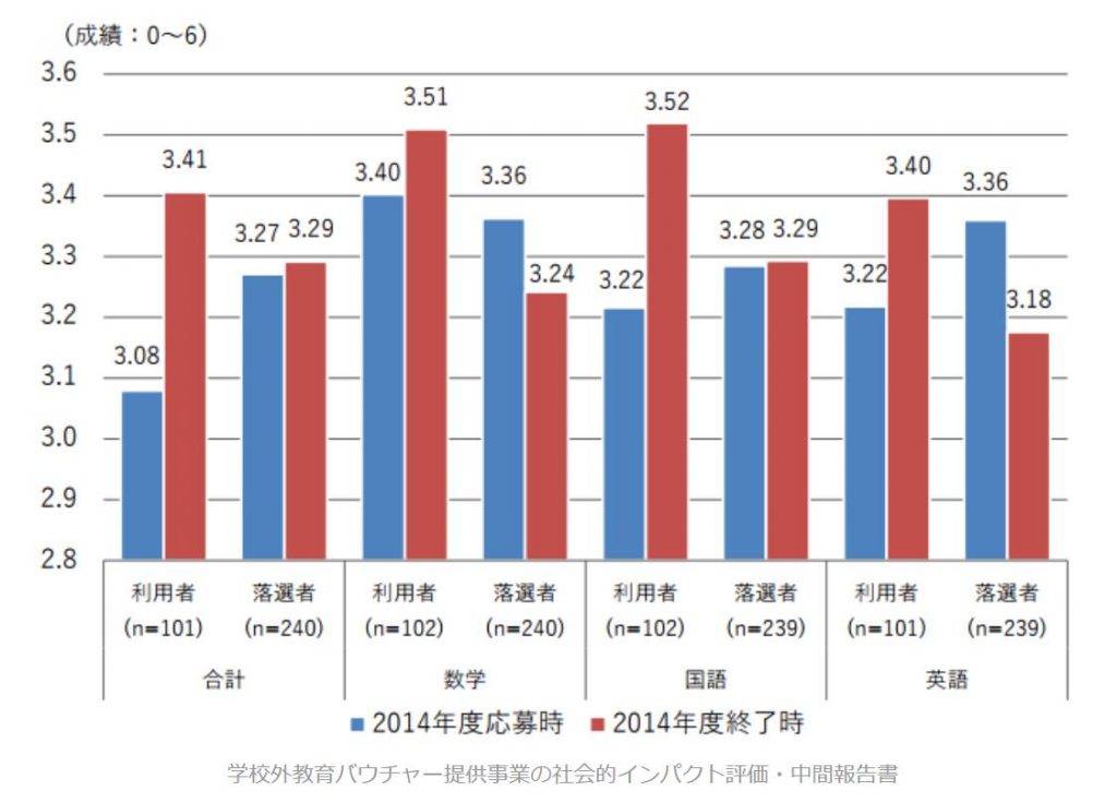 当然といえば当然ですが、クーポンを利用して塾に通った子ども達は、通塾する以前よりも成績が上がり、通塾していない子ども達と比べても成績が良かったのです。