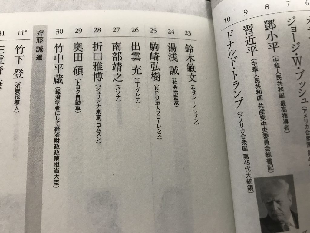 今上天皇ご退位に伴い、平成ももう終わりということで、平成を彩る人物を100人あげよう、という企画。