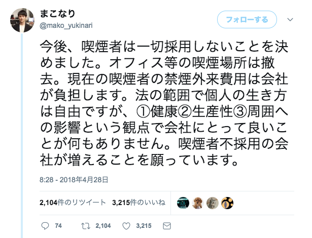 そして、企業や団体の姿勢として、従業員の完全禁煙を掲げるべきだと思います。