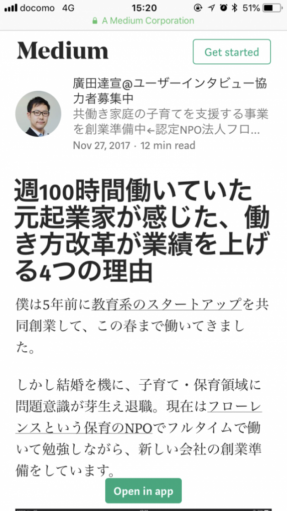 はい。「週100時間働いていた元起業家が感じた、働き方改革が業績を上げる4つの理由」という記事ですね。前職では業界全体のノリや共同創業者であるということもあってバリバリ長時間労働で。「時間あたり生産性×労働時間=アウトプット、なら生産性高く長時間働くのが1番」とか思ってました(笑)