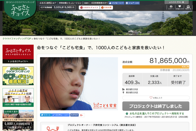 ―こども宅食のふるさと納税クラウドファンディグの画面。現在は2018年の新しいクラウドファンディングを実施中