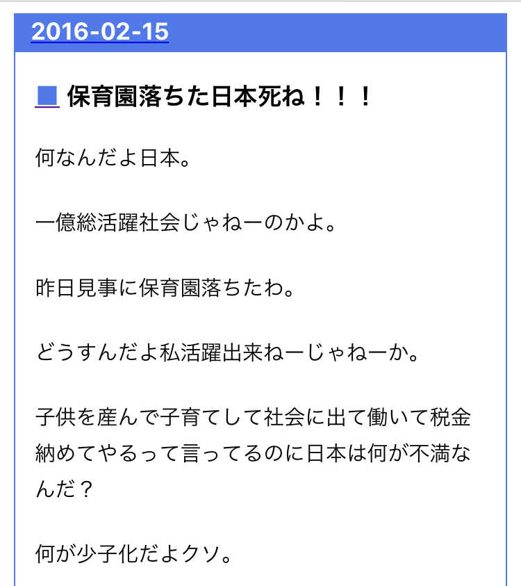 ※保育園落ちた日本死ね…2016年、匿名ブログで、子どもが保育園に入れず職場復帰できなかったお母さんが日本社会に対する不満を吐露し、話題になった