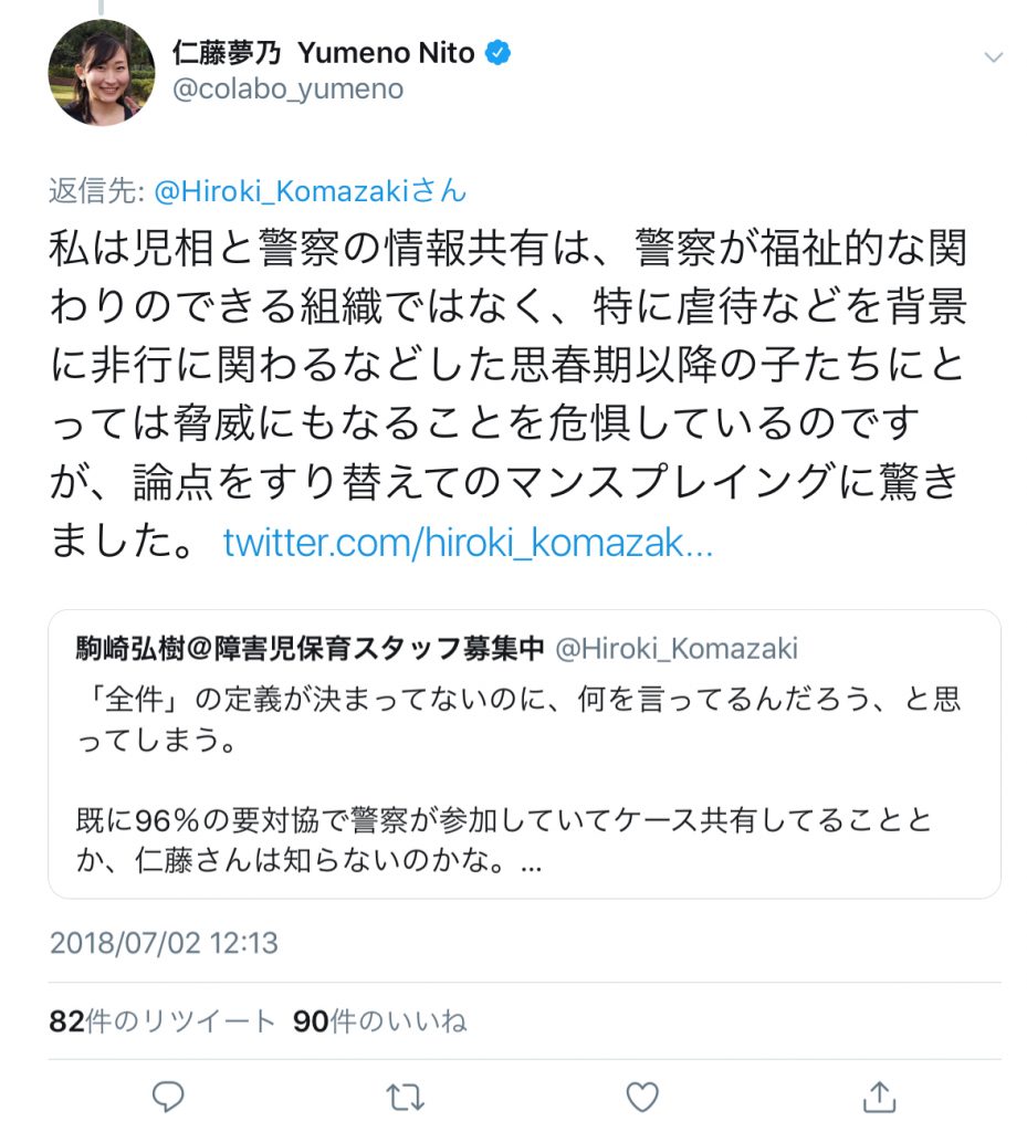 そもそも事の発端は、私が仁藤氏のツイートに対し、以下のようなコメントを付けたことでした。