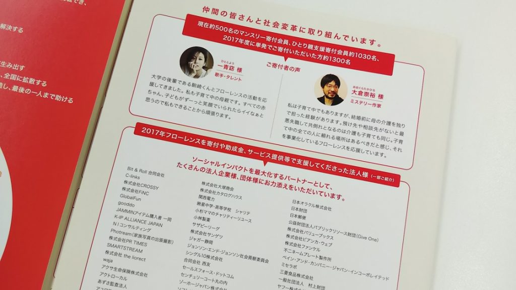 2017度にフローレンスにご寄付いただいた皆さんには、郵送でお送りしています。WEBからも(PDFですが)参照いただけますので、ぜひご覧くださいませ。