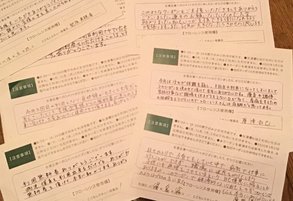 クーポンは病児保育利用の際に回収させてもらっており、裏面に設けられた利用者コメント欄には、感謝の言葉がたくさん綴られて返ってきます。