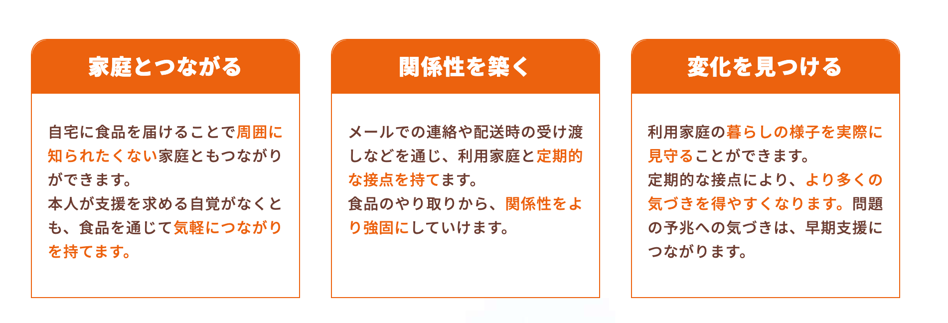 具体的には、食品の配送を通じて、困りごとを抱えた子育て家庭とのつながりを生み出し、変化を見つけて早期の支援につなげる「こども宅食」のモデルを実施する全国の運営事業者に助成や伴走支援を行っています。