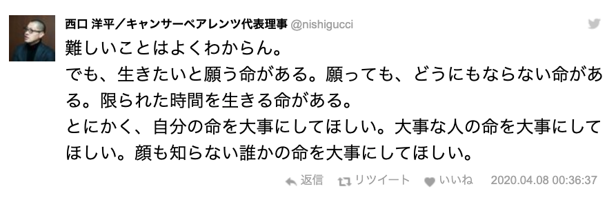 何杯飲んでも酔えずに、どうしようもなくなって、生前の西口さんの呟きを見た。