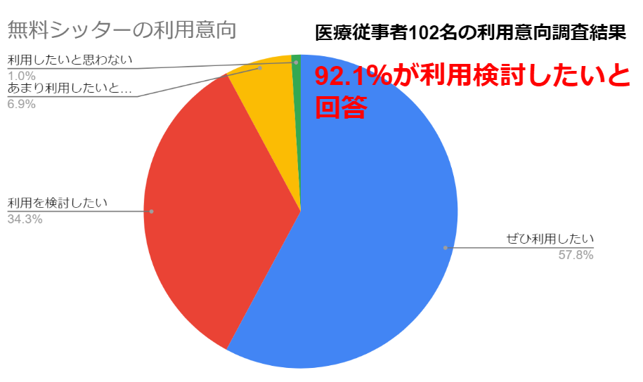 フローレンスでは、独自にコロナ医療従事者約102名に緊急アンケートを実施し、ご家庭へのシッター派遣のニーズを確認いたしました。92.1%の医療従事者が、シッター派遣について「利用を検討したい」「ぜひ利用したい」と答えています。