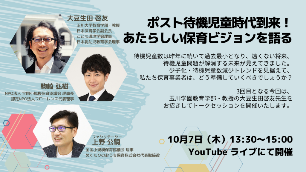 ポスト待機児童時代を迎え、今後どのようなことが必要なのか、日本保育学会副会長やこども環境学会理事、日本乳児教育学会理事などを務める大豆生田啓友先生とともに、10/7(木)にオンラインでトークセッションさせていただくことになりました!